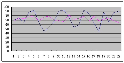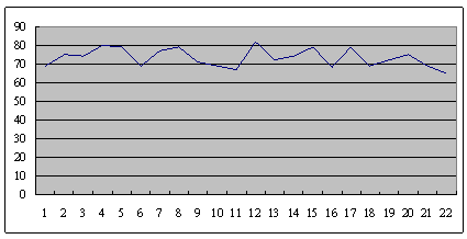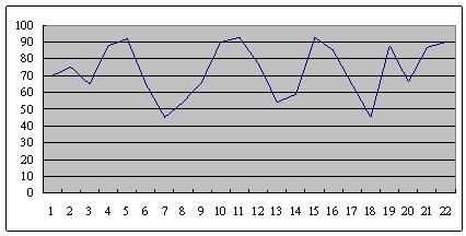 這是另外一個呼叫中心的服務水平,也是從早上8點開始,一直到晚上6點,每隔半個小時的服務水平趨勢。雖然平均服務水平也是在73左右,但震蕩幅度卻小了很多,服務水平只在81到68這中間震蕩。