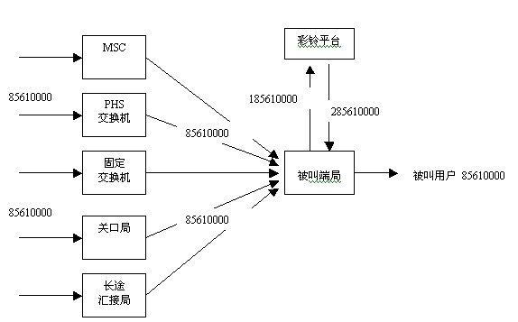 - 彩鈴平臺(tái)在收到"彩鈴平臺(tái)號(hào)碼前綴+原被叫號(hào)碼"的呼叫后,分析出業(yè)務(wù)用戶(被叫號(hào)碼),在彩鈴平臺(tái)上進(jìn)行相關(guān)的業(yè)務(wù)處理,然后在被叫號(hào)碼前加一個(gè)另外的號(hào)碼前綴(稱作"接通被叫指示前綴"),被叫號(hào)碼成了"前綴2+原被叫號(hào)碼"(避免被叫端局的二次觸發(fā)),彩鈴平臺(tái)把這個(gè)新被叫號(hào)碼接續(xù)回到被叫交換機(jī);