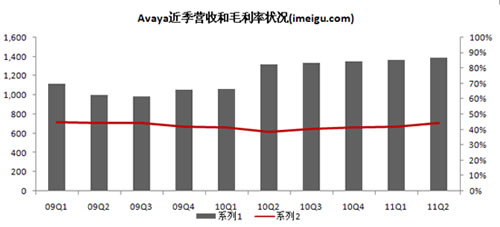 Avaya公司總體上毛利率穩(wěn)定在40%至50%之間,毛利定義為扣除相關(guān)產(chǎn)品成本和服務(wù)成本后的營業(yè)收入。2010財(cái)年公司的全球通信解決方案、數(shù)據(jù)網(wǎng)絡(luò)、Avaya全球服務(wù)等業(yè)務(wù)部門的營收分別占總營收的46%、5%、49%,毛利率分別為54%、41%、45%。