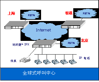 美國訊時捷™科技公司的“訊時捷™™ IPX”系統(tǒng)平臺,可以作為分布式的IP呼叫中心,并可利用各地的網(wǎng)關(guān),提供低費用的IP