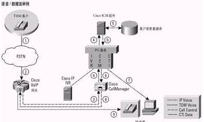 注意2:這一樣本語音/數據流描述了一個單地點IPCC實現。另外,可以將IPCC集成到一個多地點聯絡中心,并獲得ICM軟件所提供的可貫穿整個企業(yè)的、網絡級的路由預選功能所能帶來的好處。