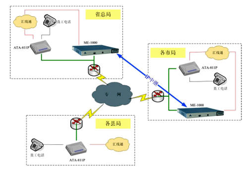 由于用戶(hù)數(shù)量較大,我們建議采取分級(jí)管理方式,利用我們Anta科技(北京)有限公司Simplicity 系列IP-PBX產(chǎn)品的靈活性,在每個(gè)市局放置一臺(tái)ME-1000型號(hào)的IP-PBX,管理市局及下屬縣區(qū)局的電話(huà)系統(tǒng);省總局放置一臺(tái)ME-1000,管理總局電話(huà)系統(tǒng);同時(shí)各市局的ME-1000向總局注冊(cè),形成IP中繼連接,組成全省互通的IP電話(huà)管理系統(tǒng)。在終端方面,我們建議采用單端口的ATA-811P桌面型語(yǔ)音網(wǎng)關(guān)連接話(huà)機(jī),該網(wǎng)關(guān)通過(guò)向IP-PBX注冊(cè),將所有模擬話(huà)機(jī)連接到VOIP系統(tǒng)中來(lái)。