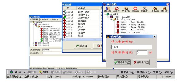 擁有管理員使用許可的桌面工具提供了比一般座席使用許可更加強大的功能,它不僅允許管理員對所屬座席進行監(jiān)控、監(jiān)聽、強插、強拆等特殊操作,還可以進行消息的組播、廣播,以及更改LED大屏幕顯示內(nèi)容等操作。另外,座席的新增、刪除、分組等操作也必須由管理員工具來完成。