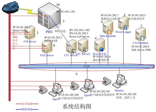 - IVR Server和FAX Server采用高品質(zhì)的工控機(jī),配置和軟件環(huán)境基本一樣。每臺(tái)機(jī)器均有30路語音接入,分別裝有一套Power