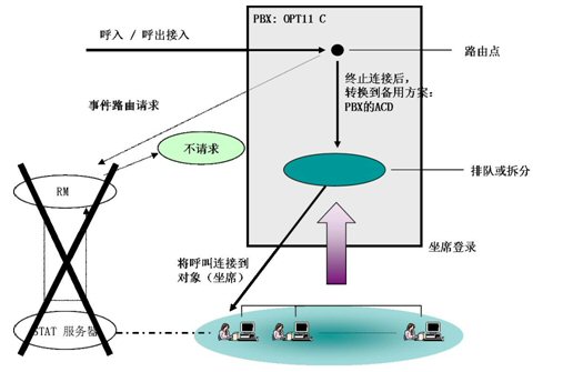 - 當(dāng)RM出現(xiàn)故障(包括Server物理損壞、RM程序意外終止、網(wǎng)絡(luò)連接失效)時(shí),RM將對(duì)電話的控制權(quán)交還給PBX,PBX根據(jù)自己的電話分配規(guī)則將電話分配到坐席。