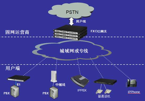 “固網(wǎng)IP化”方案無(wú)需軟交換,延用現(xiàn)有的數(shù)字程控交換機(jī)與業(yè)務(wù)支持系統(tǒng)作為核心網(wǎng)業(yè)務(wù)平臺(tái),只是在交換機(jī)外圍增加實(shí)現(xiàn)模擬/數(shù)字語(yǔ)音信號(hào)轉(zhuǎn)換成IP的VoIP網(wǎng)關(guān),并通過(guò)IP網(wǎng)絡(luò)實(shí)現(xiàn)與遠(yuǎn)程客戶終端設(shè)備的連接。遠(yuǎn)程的用戶端設(shè)備可以是傳統(tǒng)設(shè)備,如普通電話、傳真機(jī)或小型交換機(jī),也可以是基于IP的語(yǔ)音設(shè)備,如SIP電話、IPPBX等(如下圖所示)?梢詫(shí)現(xiàn)小區(qū)放號(hào)、企業(yè)直線電話、企業(yè)語(yǔ)音交換機(jī)接入等業(yè)務(wù)。