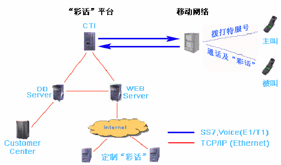 彩話業(yè)務就是在雙方通話過程中播放的由用戶事先點播的背景音樂。這項業(yè)務更多的作為一種精神消費時尚,電信運營商可作為一種時尚進行推出,可以定位為帶背景音樂的電話業(yè)務。彩話與CRBT技術(shù)原理基本相同,當呼叫進入交換機后,獲取呼叫的主被叫信息后,由交換機同時發(fā)起兩個呼叫,一個去真正被叫,另一個去彩話系統(tǒng)。當被叫方摘機,首先控制主叫與被叫接通,彩話系統(tǒng)根據(jù)被叫用戶保存的定制的彩話信息和業(yè)務邏輯然后控制彩話系統(tǒng)的IVR單元對主被叫的通話進行相應的背景語音播放操作,該語音僅作為背景音樂,不影響正常的雙方通話,類似于作一個三方會議的操作。當被叫掛機時,交換機將IVR單元和被叫的連接斷開,這樣就完成了一個完整的彩話服務。