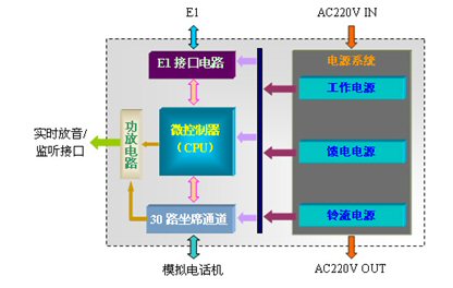 本產(chǎn)品內(nèi)部功能模塊仍然使用杭州三匯公司的內(nèi)線模塊(User),單機(jī)高達(dá)30路模擬電話機(jī)接口。E1中繼至模擬話機(jī)接口的轉(zhuǎn)換和模擬話機(jī)的摘機(jī)檢測、振鈴控制功能等則有自帶的CPU及嵌入式軟件完成。