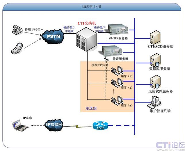 CTI/ACD服務(wù)器:是呼叫中心平臺(tái)的核心,不僅通過(guò)CTI Link控制交換機(jī)話路接續(xù),而且還兼顧系統(tǒng)其他設(shè)備的管理監(jiān)控等功能。