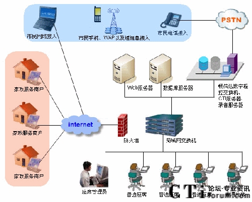 隨著國內城市化地不斷加快,人口老齡化的加劇,人民群眾對家政服務需求也越來越旺盛,家政服務業(yè)的重要性也日益凸顯。為了規(guī)范家政服務市場、整合家政市場資源、培育家政服務示范性企業(yè),國家商務部、財務部于2009年4月下發(fā)了《關于推進家政服務網(wǎng)絡體系建設的通知》的149號文件,啟動了家政服務網(wǎng)絡中心體系建設的項目,并提出了具體的規(guī)范和要求。以此為起點,為更好地服務社會滿足人民群眾日益增長的生活需求而努力。自文件下發(fā)以來,我公司就組織專門的項目組,對家政服務行業(yè)具體業(yè)務需求的調研以及開發(fā)工作。公司利用多年的開發(fā)經(jīng)驗,經(jīng)過幾個月的努力,終于在8月份完成了暢信達家政服務網(wǎng)絡中心的全套建設方案。與其它系統(tǒng)固化的功能設計不同,該方案可以靈活地定制業(yè)務模塊,方便各地的家政公司根據(jù)本市的情況和需求,確定適合自身的業(yè)務流程。系統(tǒng)業(yè)務模塊完整地覆蓋了家政服務的業(yè)務范圍與重點。并將家政服務的業(yè)務分為營業(yè)系統(tǒng)、賬務系統(tǒng)、后臺系統(tǒng)等部分,貫穿了市民從訴求提交、工單派發(fā)、工單處理、財務結算到回訪反饋的各個方面。系統(tǒng)還提供了完善的報表模塊準確反映業(yè)務和系統(tǒng)運營狀況,有力地支持對平臺進行運營管理工作。另外在方案設計上,除了滿足業(yè)務處理需要外,還充分考慮到系統(tǒng)的適應性、穩(wěn)定性和處理的能力。首先為了滿足各地市對家政平臺的不同需求,公司專門推出了基于IBM服務器的和暢信達標配服務器的兩種建設方案。暢信達標配服務器方案可提供最低4模擬外線最多1條數(shù)字中繼(E1)接入,適用于初期規(guī)模較小且投資規(guī)模不大的客戶。而基于IBM服務器的方案,則主要是滿足業(yè)務量較大,同時對設備配置要求高的城市,以數(shù)字線接入為主。多種建設模式充分體現(xiàn)了方案的靈活性、可擴展性的特征,有效地減少了運營風險,提升了個性化定制化服務的水平。其次,根據(jù)家政市場需求預測以及已開通家政服務網(wǎng)絡中心城市的實際運營情況,一個中型城市,預計電話開通之后,話務量平均每天近3000個,這就要求系統(tǒng)不但有穩(wěn)定的性能而且要有強大的處理能力。我公司從系統(tǒng)平臺構建、業(yè)務流程設計、設備性能、組網(wǎng)設計等方面著手,為系統(tǒng)提供了足以確保安全穩(wěn)定運行的支持。
