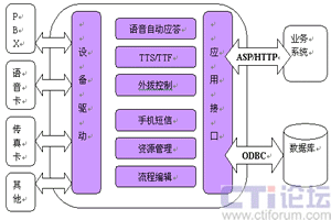 CTI服務(wù)器是整個(gè)系統(tǒng)的核心,通過(guò)內(nèi)置電話語(yǔ)音/傳真卡,接入PSTN電話網(wǎng)。該服務(wù)器可作為一個(gè)相對(duì)獨(dú)立的系統(tǒng)單獨(dú)運(yùn)行,也可以通過(guò)企業(yè)局域網(wǎng)與企業(yè)的業(yè)務(wù)系統(tǒng)連接。