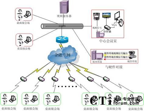 根據(jù)上圖可以知道,在全南縣信用社中心機(jī)房部署一臺(tái)視頻服務(wù)器,這臺(tái)視頻服務(wù)器主要提供各個(gè)會(huì)場(chǎng)進(jìn)行召開(kāi)會(huì)議訪問(wèn),同時(shí)提供遠(yuǎn)程對(duì)系統(tǒng)管理和維護(hù)功能;在全南縣信用社硬件視頻會(huì)議室部署一臺(tái)帶有采集卡PC主機(jī),這臺(tái)PC用和硬件視頻會(huì)議對(duì)接,由硬件視頻會(huì)議提供一路視頻和一路音頻輸出信號(hào),再把硬件提供輸出視頻信號(hào)接入PC主機(jī)上采集卡上,輸出音頻信號(hào)接入PC主機(jī)聲卡麥克風(fēng)上,這樣只要開(kāi)會(huì)是把這臺(tái)PC主機(jī)訪問(wèn)視頻服務(wù)器登錄會(huì)議室其它會(huì)場(chǎng)就可以收聽(tīng)收看到硬件視頻會(huì)議會(huì)內(nèi)容。其它各個(gè)支行和網(wǎng)點(diǎn)會(huì)場(chǎng)通過(guò)金融專(zhuān)網(wǎng)訪問(wèn)視頻服務(wù)器,就可以參加會(huì)議、培訓(xùn)、討論交流問(wèn)題等功能。