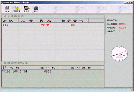 錄音坐席為網(wǎng)音公司開發(fā)的基于3Com NBX wavphone的軟件電話,與pcXset功能基本相同,能實現(xiàn)外撥、應(yīng)答、掛機、電話會議、呼叫轉(zhuǎn)移、呼叫保持等常用功能。