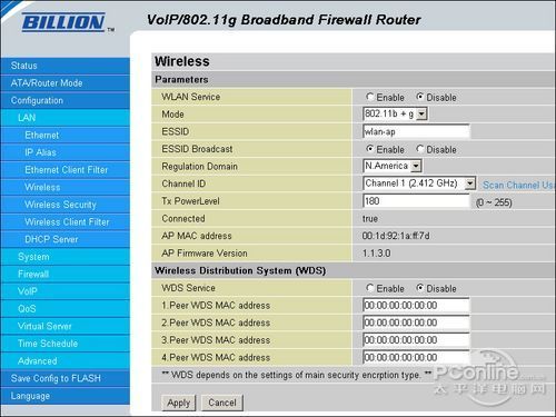 BiPAC 6404VGP的無線部分符合802.11b/g規(guī)范,最高無線速率可達(dá)54Mbps。無線部分的常規(guī)設(shè)置例如WIFI功能開關(guān)、SSID名稱自定義、SSID隱藏、信道選擇、WDS無線橋接等功能齊全。