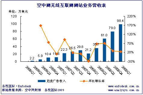 空中網第一季度移動無線互聯(lián)網網站營收為98萬美元,同比增長309%,比上一季度增長24%?罩芯W在kong.net品牌優(yōu)勢明顯的基礎上不斷推出優(yōu)質的體育內容,繼NBA、CBA后,空中網于2009年初與體壇傳媒簽訂合作關系,獲得傳媒電信增值業(yè)務的獨家授權,同時取得體壇傳媒旗下8刊一網的全部內容版權。易觀國際認為,優(yōu)質的體育資源將為空中網帶來與之相關的大量廣告主資源。
