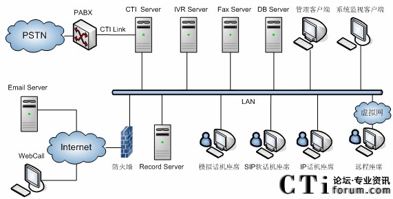 | 7 | 座席 | 也稱(chēng)為業(yè)務(wù)代表,其基本配置為一臺(tái)PC和一個(gè)帶耳機(jī)和話筒的電話機(jī),完成用戶呼入的人工受理。它和排隊(duì)機(jī)ACD相連,同時(shí)接受CTI服務(wù)器的控制。在電話進(jìn)入后的任何過(guò)程中均可以實(shí)現(xiàn)自動(dòng)流程處理與人工座席處理的靈活切換。在自動(dòng)應(yīng)答系統(tǒng)不能回答用戶問(wèn)題時(shí),能夠在呼叫用戶的控制下進(jìn)入到人工應(yīng)答系統(tǒng);在不再需要人工應(yīng)答時(shí),可切換到自動(dòng)應(yīng)答系統(tǒng)回答用戶的問(wèn)題。