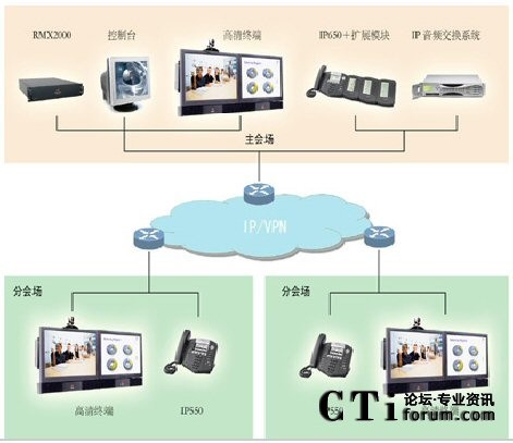 每個會場分配一個專用的IP地址,終端設(shè)置一部Polycom IP550電話, 在中心會場的指揮電話及擴(kuò)展模塊上設(shè)置每個分會場快速呼叫功能鍵,中心會場的管理人員只需按下IP650及擴(kuò)展模塊上的對應(yīng)于各分會場的快捷按鍵,即可迅速接通各個分會場。