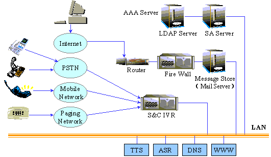 目前,S&C UMS統(tǒng)一消息系統(tǒng)由接入及交互式語音應答模塊、VoIP接入模塊、傳真服務模塊、公用消息存儲及開放訪問服務器、LDAP(lightweight directory access protocol)SERVER、WEB服務器、消息到達通知模塊、TTS服務模塊、統(tǒng)一消息平臺管理模塊、SOCKET安全及加密模塊組成,正是這些模塊構(gòu)筑了S&C UMS強大的后臺支持。