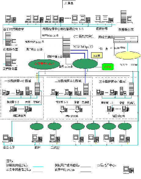 - 樹立大網(wǎng)絡概念:采用先進的通訊、計算機網(wǎng)絡技術(shù)(采用CTI可編程交換技術(shù)),利用現(xiàn)有的通信資源,實現(xiàn)市局指揮中心與消防大隊、交警大隊、各派出所的計算機網(wǎng)絡及相關(guān)領導辦公室計算機大聯(lián)網(wǎng);形成全市范圍內(nèi)110、119、122有線、無線全方位立體調(diào)度語音通道大網(wǎng)。