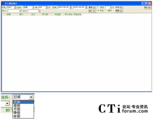 在員工通話統(tǒng)計中,從選擇欄中可以選擇日報、周報、月報、季報、年報這五種統(tǒng)計方式,分別統(tǒng)計當(dāng)天、當(dāng)周、當(dāng)月、當(dāng)季、當(dāng)年的員工的通話信息(呼入電話的個數(shù)、呼出電話的個數(shù)、呼入通話的時長、呼出通話的時長)。