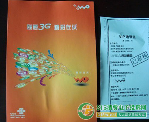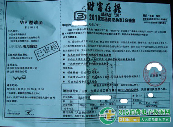 前不久,齊先生接到一個(gè)自稱中國(guó)聯(lián)通客服負(fù)責(zé)人的電話,邀他參加“3G經(jīng)濟(jì)高峰論壇”。起初他并不相信,但對(duì)方發(fā)來(lái)的“財(cái)富在握”的邀請(qǐng)函上,顯要位置確實(shí)打著“精彩在沃,聯(lián)通與您共享3G盛宴”的字樣,并且支持單位也是“中國(guó)聯(lián)合通信網(wǎng)絡(luò)有限公司佛山市禪城分公司”(詳見下圖)。一想到中國(guó)聯(lián)通是國(guó)企,也是大公司,值得依賴,再加上自己是聯(lián)通公司十幾年的老用戶,所以未加多想就答應(yīng)參加了。