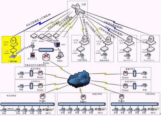如上圖所示,本系統(tǒng)是一個(gè)由H.323和H.320組成的混合組網(wǎng)的視頻會議系統(tǒng),總局空管局和華北、華東、東北空管局是通過地面ATM網(wǎng)絡(luò)傳輸,采用的是H.323協(xié)議組網(wǎng),而中南、西南、西北和新疆空管局及其下屬各個(gè)空管中心(站)采用兩種連接方式,一種是一期建設(shè)的ATM網(wǎng)絡(luò),另一種是衛(wèi)星網(wǎng)絡(luò),衛(wèi)星網(wǎng)絡(luò)采用的是H.320協(xié)議組網(wǎng)。其中,在H.320協(xié)議組網(wǎng)的系統(tǒng)中,終端又可分為雙向通訊終端和單向通訊終端,為了節(jié)約衛(wèi)星通道的租用費(fèi)用,其中4條線路采用雙向通訊方式,剩下線路采用單向接收的方式。