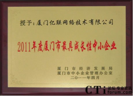 億聯(lián)公司憑借國際領(lǐng)先技術(shù)、快速穩(wěn)定的增長模式、良好的企業(yè)信用以及為全球客戶提供高品質(zhì)、高性價(jià)比的產(chǎn)品和專業(yè)快速的技術(shù)支持在眾多參選企業(yè)中表現(xiàn)優(yōu)異,獲得了評(píng)委們一致的青睞,最終捧回了“2011年廈門市最具成長性中小企業(yè)”大獎(jiǎng)。