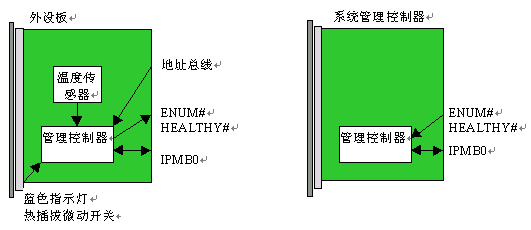 PICMG 2.9規(guī)范得到了進一步的改善,增補了一份變更通知,解決了最初2.9規(guī)范中的一些缺陷。ECR致力于定義一種就軟件來說與硬件無關的機制,這種機制能判別背板的容量以及哪個槽位已經插入了CompactPCI單板。位于一個標準CompactPCI單板上的管理控制器可能會和地址總線、位于單板把手上熱插拔微動開關、藍色的熱插拔燈、甚至是HEALTHY和ENUM#信號聯(lián)通。典型的系統(tǒng)管理控制器板與位于外設板上的管理控制器的聯(lián)接如下圖3所示:
