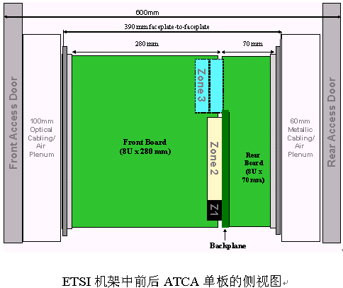 PICMG 3.0機構要求主要來自于對600mm ETSI 和19" EIA標準機柜空間使用的研究。PICMG 3.0委員會在考慮單板尺寸能支持下一代元器件對物理和散熱的需求的同時,機箱空間能和板子能達到最大限度的配合和利用。最初的工作是基于歐規(guī)卡的標準,繼而又提升到支持低成本的片狀金屬架構(簡單電訊封裝)。對后走線模塊的支持滿足了對后I/O應用的需求。在決定可以使用的單板空間時,也充分考慮了前、后板的進深范圍以供大量電纜束綁空間。經過對不同規(guī)格尺寸的單板的優(yōu)點進行討論之后,PICMG 3.0組織統一規(guī)格如下:前板 8U x 280mm,進深1.2" pitch,選配后板8U x 70mm深;1.2" pitch,19" EIA機框可以支持14槽,而600mm ETSI的機框可以支持16槽。下圖所示為600mm ETSI機架中的ACTA前后單板的側視圖: