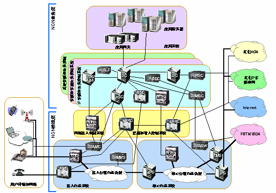 NGN網(wǎng)絡(luò)邏輯上可分為用戶網(wǎng)、接入網(wǎng)和核心網(wǎng)。網(wǎng)絡(luò)的管理界限將NGN劃分為一些不同的NGN域。接入網(wǎng)和核心網(wǎng)可在同一NGN域中,也可以屬于不同的域。域內(nèi)的網(wǎng)絡(luò)拓?fù)湫畔⒖梢詫?duì)外屏蔽。域和域之間的互通將通過網(wǎng)關(guān)來完成。NGN支持與現(xiàn)有的網(wǎng)絡(luò)互通,如電話網(wǎng)絡(luò)、蜂窩網(wǎng)絡(luò)、互聯(lián)網(wǎng)等。NGN還支持各種有"NGN意識(shí)"的用戶設(shè)備和現(xiàn)有的無"NGN意識(shí)"的終端,如模擬電話機(jī)、傳真機(jī)、ISDN終端等。這些互通都通過網(wǎng)關(guān)來完成。NGN的網(wǎng)關(guān)主要包括多媒體接入網(wǎng)關(guān)、接入媒體網(wǎng)關(guān)、中繼媒體網(wǎng)關(guān)、分組網(wǎng)關(guān)和信令網(wǎng)關(guān)。