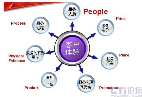 下面這張圖是服務(wù)營銷的7P模型,在這里我認(rèn)為最應(yīng)該關(guān)注的是People——人。這里,我想引用世界經(jīng)理人刊登的一篇文章“影響中國的十大管理理念”上的一段文字:“邁向服務(wù)型經(jīng)濟(jì)實(shí)際上就是邁向人才經(jīng)濟(jì)。在制造業(yè)中,價(jià)值是由機(jī)器創(chuàng)造的。在服務(wù)業(yè)中,價(jià)值則是人創(chuàng)造的。”這也是在服務(wù)業(yè)中,要將“人”進(jìn)行體現(xiàn)。也許你不在乎為你制造產(chǎn)品的工人長的美或丑,但為客戶服務(wù)的人員如果長的很丑,對服務(wù)就會(huì)有一定的影響。大家只看產(chǎn)品結(jié)果,不關(guān)注過程,但是服務(wù)卻是與過程緊密的結(jié)合。