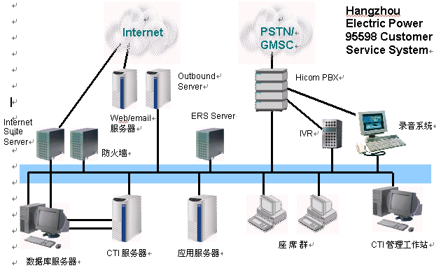 西門子Hicom 350E,作為杭州電力"95598"客服系統(tǒng)的通信服務(wù)器,以其出色的品質(zhì)和強(qiáng)大的功能保證了整個(gè)系統(tǒng)的正常運(yùn)行。同時(shí)充分利用杭州電力局原有的通訊線路,創(chuàng)新性的在原有的SDH(同步數(shù)字體系)網(wǎng)絡(luò)上利用HiPath HG 3200遠(yuǎn)端模塊,將中心的人工坐席延伸到了五個(gè)郊縣電力公司,真正解決了全市統(tǒng)一接入,一個(gè)號碼對外,業(yè)務(wù)本地受理的問題;同時(shí)遠(yuǎn)端坐席的工作方式真正做到和中心完全一致,給使用、管理、培訓(xùn)等帶來極大的便利。