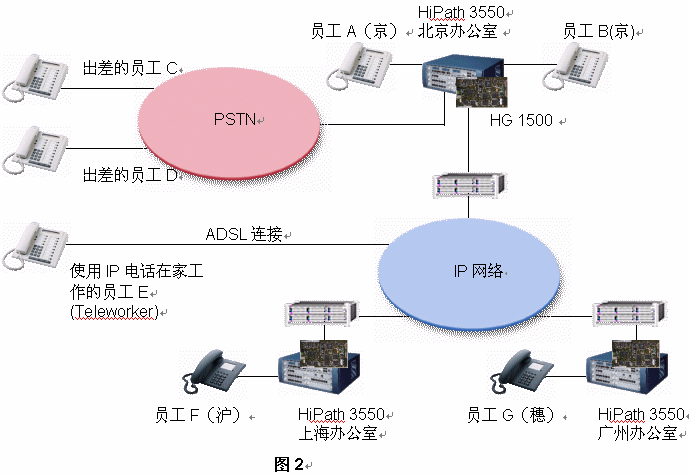 西門子推薦該公司每一個(gè)辦公室均采用HiPath 3550 PBX。如果,A公司每個(gè)辦公室已經(jīng)擁有DDN專線或ADSL連接至Internet,它就能將其內(nèi)部通信建設(shè)在現(xiàn)存的IP網(wǎng)絡(luò)的基礎(chǔ)之上。其集成網(wǎng)關(guān)HiPath 1500被用來(lái)連接數(shù)據(jù)網(wǎng)絡(luò)和語(yǔ)音網(wǎng)絡(luò)。在這樣的網(wǎng)絡(luò)架構(gòu)中,路由冗余能夠得到充足的保證,因?yàn)槲鏖T子HiPath解決方案提供了最大的網(wǎng)絡(luò)存活性:即使IP網(wǎng)絡(luò)出現(xiàn)故障,西門子網(wǎng)絡(luò)設(shè)置能夠?qū)⒙酚勺詣?dòng)切換至PSTN之上。