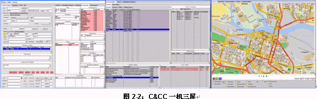 - 一機(jī)三屏:一屏CAD,另一屏為GIS,第三屏專用于資源調(diào)度。與雙屏配置相比,三屏配置的優(yōu)勢在與資源調(diào)度更加直接、快捷,同時更可以整合無線調(diào)度通訊資源。但是三屏配置需要較復(fù)雜的客戶化工作。
