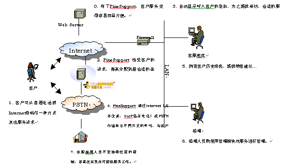 FineSupportTM網(wǎng)通呼叫中心解決方案主要由以下幾個(gè)部分組成:Media Gateway(接受來(lái)自IP網(wǎng)的網(wǎng)絡(luò)電話、傳統(tǒng)電話等呼叫,傳送給軟交換系統(tǒng))、Service Switch(軟交換系統(tǒng),負(fù)責(zé)呼叫控制)、IP IVR(存儲(chǔ)顧客呼叫信息,播放語(yǔ)音提示信息)、Soft ACD(呼叫分配服務(wù)器,可定制多種分配策略)、Web Server(負(fù)責(zé)報(bào)表管理、站點(diǎn)管理和監(jiān)控、FAQ存儲(chǔ)管理、留言及文本交談管理等)、Chat Server(建立交談通道)、Remote Agent(坐席工作站。通過客戶端軟件進(jìn)行客服支持)。