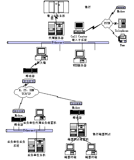 用TCP/IP協(xié)議,通過網(wǎng)關(guān)與銀行主機進行連接,可以根據(jù)各業(yè)務(wù)單位的實際情況選用TCP/IP,SNA/SDLC等協(xié)議與業(yè)務(wù)單位主機進行連接。
