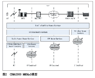 over IP稱(chēng)為移動(dòng)IP Phone。圖3顯示了CDMA2000 LMSD網(wǎng)絡(luò)為了滿(mǎn)足端到端QoS要求,而設(shè)置的多層不同承載服務(wù)級(jí)別、網(wǎng)元間的端到端QoS保證機(jī)制。