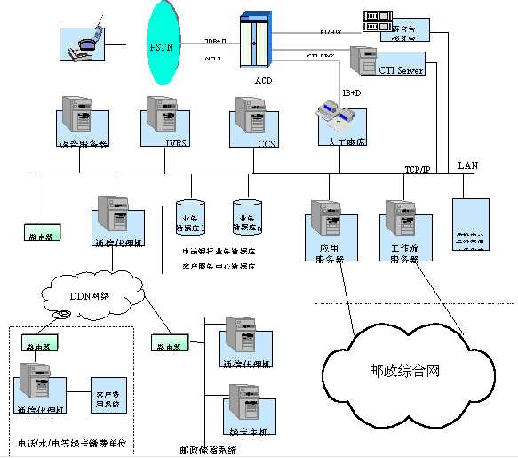 郵政呼叫中心在現(xiàn)有郵政綜合網(wǎng)的基礎上,利用電話服務廣泛普及,方便快捷的優(yōu)點,采用CTI技術,把綜合網(wǎng)提供的諸多并行的多種業(yè)務無縫集成,為綜合網(wǎng)提供一個集成多種服務功能為一體的橫向服務。