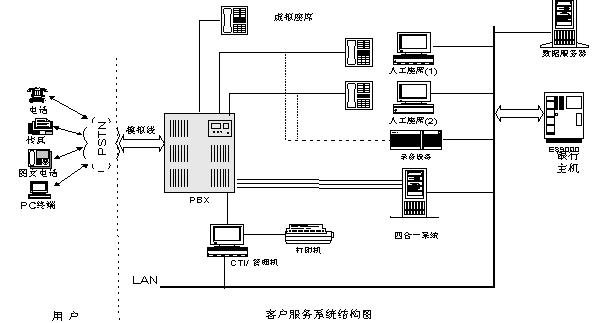 由中國光大電腦開發(fā)有限公司提供的,中小規(guī)模銀行客戶服務(wù)中心系統(tǒng)解決方案,特別適合地市級(jí)銀行的需要。該系統(tǒng)已成功地應(yīng)用于工行石家莊分行,向工行客戶提供16線對(duì)公、儲(chǔ)蓄、信用卡電話銀行自動(dòng)應(yīng)答和6線人工咨詢兩類服務(wù)。其中電話銀行自動(dòng)應(yīng)答包括16路語音自動(dòng)應(yīng)答、12路傳真、8路圖文電話和計(jì)算機(jī)遠(yuǎn)程服務(wù)。