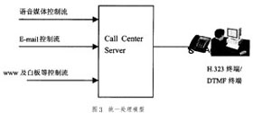 目前,IP Call Center實(shí)現(xiàn)綜合媒體統(tǒng)一處理的方式已取得比較一致觀點(diǎn),即如圖3的語(yǔ)音媒體流和IP傳真、Web主頁(yè)、Email進(jìn)入座席群前先經(jīng)過(guò)一個(gè)服務(wù)軟件進(jìn)行統(tǒng)一處理,該服務(wù)軟件一般廠家都稱為Call Center Server(簡(jiǎn)稱CCS服務(wù)器),它起著完成呼叫控制、路由處理、與呼叫同步的用戶數(shù)據(jù)管理及信息監(jiān)視等作用。
