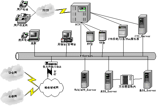 呼叫中心的功能主要有兩方面,一是與用戶進行交互,另外與金融主機房進行數(shù)據(jù)交互。呼叫中心系統(tǒng)由兩部分組成:聲訊平臺(CALL CENTER)和業(yè)務(wù)數(shù)據(jù)計算機網(wǎng)絡(luò)平臺。聲訊平臺由話務(wù)接入設(shè)備(ACD)、IVR系統(tǒng)和CTI服務(wù)器組成,主要負責語音資源的管理、呼入話務(wù)的排隊、自動業(yè)務(wù)以及人工座席的管理等;業(yè)務(wù)數(shù)據(jù)計算機網(wǎng)絡(luò)平臺是對業(yè)務(wù)數(shù)據(jù)的收集、使用、管理、分析等。平臺間通過CTI技術(shù)實現(xiàn)數(shù)字數(shù)據(jù)和語音數(shù)據(jù)的相互轉(zhuǎn)換和同步轉(zhuǎn)移。系統(tǒng)結(jié)構(gòu)如下。