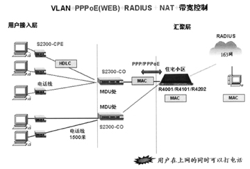 圖2所示的是VDSL技術(shù)與以太網(wǎng)技術(shù)聯(lián)合打造的新型接入方案。武漢烽火網(wǎng)絡(luò)公司生產(chǎn)的S2300系列VDSL交換機(jī)使用戶在現(xiàn)有電話線路上獨(dú)立享用固定的獨(dú)立的帶寬,安全地進(jìn)行數(shù)據(jù)連接,同時(shí)以太網(wǎng)的PPPoE認(rèn)證、NAT地址變換等功能又將用戶帶入迷幻的網(wǎng)絡(luò)世界。