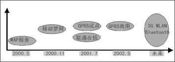 2000年5月,中國(guó)移動(dòng)推出了WAP服務(wù),但是由于準(zhǔn)備不足,加之中國(guó)移動(dòng)沒有完全轉(zhuǎn)變經(jīng)營(yíng)理念,使得WAP服務(wù)沒有達(dá)到預(yù)期的發(fā)展目標(biāo)。在吸取WAP服務(wù)的經(jīng)驗(yàn)、教訓(xùn)后,中國(guó)移動(dòng)于2000年11月又推出了“移動(dòng)夢(mèng)網(wǎng)”計(jì)劃。在這次的業(yè)務(wù)推廣中,短消息受到了人們的寵愛,發(fā)展到現(xiàn)在,SMS已經(jīng)深入多數(shù)移動(dòng)用戶的心中。2001年7月,中國(guó)聯(lián)通也推出了“聯(lián)通在信”與“移動(dòng)夢(mèng)網(wǎng)”進(jìn)行競(jìng)爭(zhēng)(如圖1所示)。與此同時(shí),中國(guó)移動(dòng)又開始了GPRS的試點(diǎn)工作,經(jīng)過近一年時(shí)間,“聯(lián)通在信”并沒有取得更好的成績(jī),而中國(guó)移動(dòng)的GPRS終于開始正式商用。那么,未來的移動(dòng)數(shù)據(jù)業(yè)務(wù)將依托什么來發(fā)展呢?是3G,還是WLAN、藍(lán)牙?大家只能拭目以待。