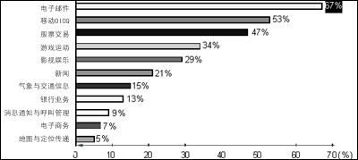 到底有多少人需要移動(dòng)數(shù)據(jù)業(yè)務(wù)呢?有資料顯示,當(dāng)前有36%的人對(duì)移動(dòng)數(shù)據(jù)業(yè)務(wù)處于觀望狀態(tài),只要移動(dòng)數(shù)據(jù)業(yè)務(wù)發(fā)展得好,他們肯定會(huì)加入進(jìn)來。我們相信,現(xiàn)在已經(jīng)有一定比例的人開始從觀望狀態(tài)加入使用移動(dòng)數(shù)據(jù)業(yè)務(wù)的行列中來。如圖2所示,在用戶需求中,電子郵件占67%,娛樂性的業(yè)務(wù)也占有較高的比例,新聞、信息類其次。這些數(shù)據(jù)說明,人們使用移動(dòng)數(shù)據(jù)業(yè)務(wù),大部分的習(xí)慣是沿襲互聯(lián)網(wǎng)的,這也為移動(dòng)網(wǎng)絡(luò)與互聯(lián)網(wǎng)的結(jié)合奠定了用戶基礎(chǔ)。