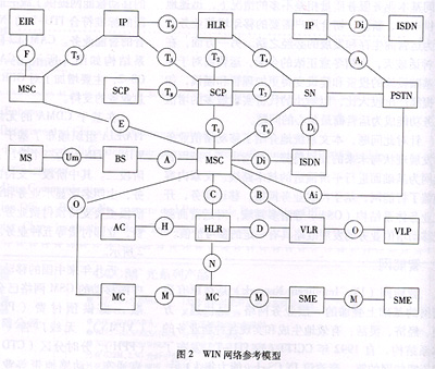 在基于CDMA的無線智能網方面,北美的TIA/EIA組織頒布了基于CS-2的無線智能網規(guī)范WIN。WIN分為三個階段:階段一、預付費階段和階段二。其中階段一支持的主要業(yè)務有來話篩選業(yè)務,主叫名字顯示業(yè)務和語音控制的業(yè)務,預付費階段主要支持預付費業(yè)務,階段二支持被叫集中付費,立即付費等五種業(yè)務。WIN網絡參考模型如圖2所示。
