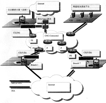 鑒于客戶(hù)是通信公司,有較強(qiáng)的系統(tǒng)管理能力,而且要求視訊和數(shù)據(jù)出口分開(kāi),視訊出口在北京,可以和VPN線(xiàn)路走相同的物理鏈路,不會(huì)造成路由設(shè)計(jì)上的問(wèn)題,故將NAT放在客戶(hù)公司總部,由用戶(hù)自己管理,增加DIA出口和費(fèi)用。網(wǎng)絡(luò)通信拓?fù)鋱D如右所示。