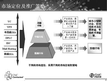 為了打開網(wǎng)通視訊業(yè)務(wù)的局面,網(wǎng)通的推廣方案也非常完備,這位負(fù)責(zé)人向記者出示了一張圖(見左下圖),詳細(xì)地解釋了網(wǎng)通視訊業(yè)務(wù)的市場定位及推廣策略。首先是通過媒體宣傳給客戶以整體印象,力求覆蓋面廣,眾所周知; 接著以直郵形式有針對(duì)性地發(fā)放詳細(xì)單頁資料,深入宣傳;然后以小型研討會(huì)、技術(shù)講座等形式,有針對(duì)性地召集當(dāng)?shù)啬繕?biāo)客戶/潛在用戶,細(xì)論VC市場及產(chǎn)品; 最后是以巡展、樣板客戶案例造聲勢,提高產(chǎn)品形象。