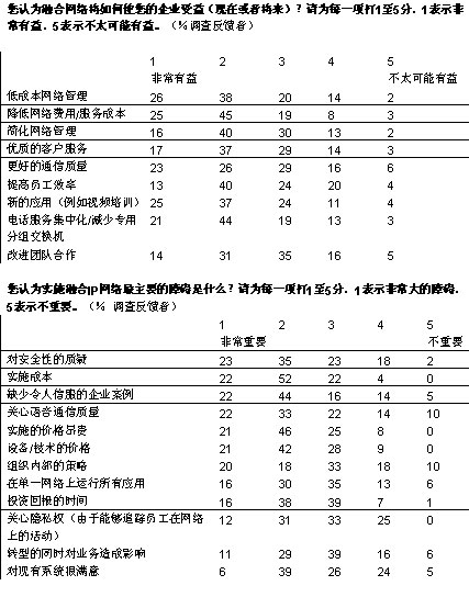 網絡融合不僅意味著削減電話費用,改進視頻會議。許多企業(yè)組織都在考察如何使用融合網絡改善團隊合作和提高生產力;與客戶、合作伙伴和供應商進行更好的溝通;以及對日益復雜的網絡進行規(guī)范管理。此外,在這個病毒、蠕蟲和黑客肆虐的年代,管理者非常關注如何通過融合來提高網絡的安全性。