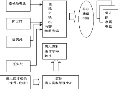 病人資料數(shù)據(jù)庫保存的病人資料均與病人住院、就診代號對應,醫(yī)護人員因工作需要欲與病人或家屬聯(lián)系時,使用本部門的電話通過呼叫中心獲得使用權(quán)限。交換機給醫(yī)院內(nèi)部指定一個"特服號碼",負責與病人通信。