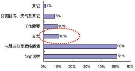 首先從使用目的看,我們的調(diào)查研究表明,大部分用戶使用短信最主要的目的是節(jié)省話費,該類用戶比例高達(dá)51%; 其次是與朋友分享,以及聯(lián)絡(luò)感情,比例為50%; 而其他如交友、工作需要、訂閱新聞、天氣及其他等所占比例較低,均不超過10%。由此可見,雖然短信業(yè)務(wù)已經(jīng)深入地滲透了用戶的生活,但是用戶的主要應(yīng)用仍然是點對點的應(yīng)用,信息類的應(yīng)用只占很小的部分(見圖2)。